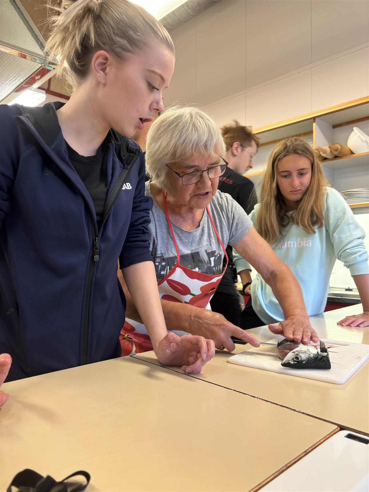 Signe Gabrielsen gir en innføring til ungdommene hvordan fisken tilberedes som en del av matlagingen.Dag 3: Havet